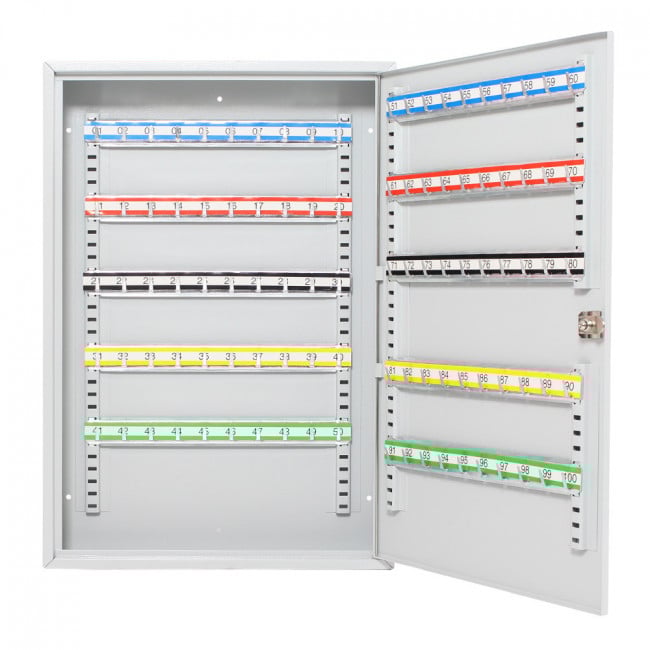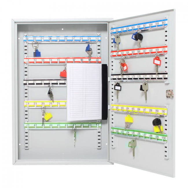 Modelul Rottner S100 este echipat cu incuietoare cilindrica pe cheie (2 chei incluse) si permite depozitarea organizata a pana la 100 de chei pe carlige numerotate si etichetate.