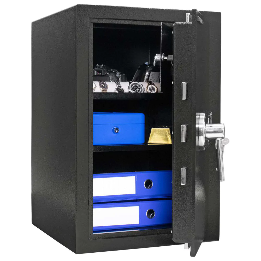 Acest model include doua rafturi reglabile si un seif interior fix cu incuietoare separata, ideal pentru organizarea valorilor dupa nivelul de acces „master/user”.