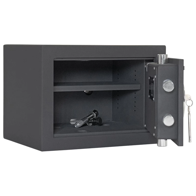 Carcasa este formata din pereti multipli ranforsati, iar usa are o grosime de 12 mm, asigurand rezistenta la fortare. Inchiderea se realizeaza cu cheie dubla barbie, protejata impotriva taierii si gauririi. Mecanismul cu bolturi in 3 directii blocheaza usa in mod sigur, iar balamalele interioare limiteaza deschiderea la 90°, pentru o securitate suplimentara.