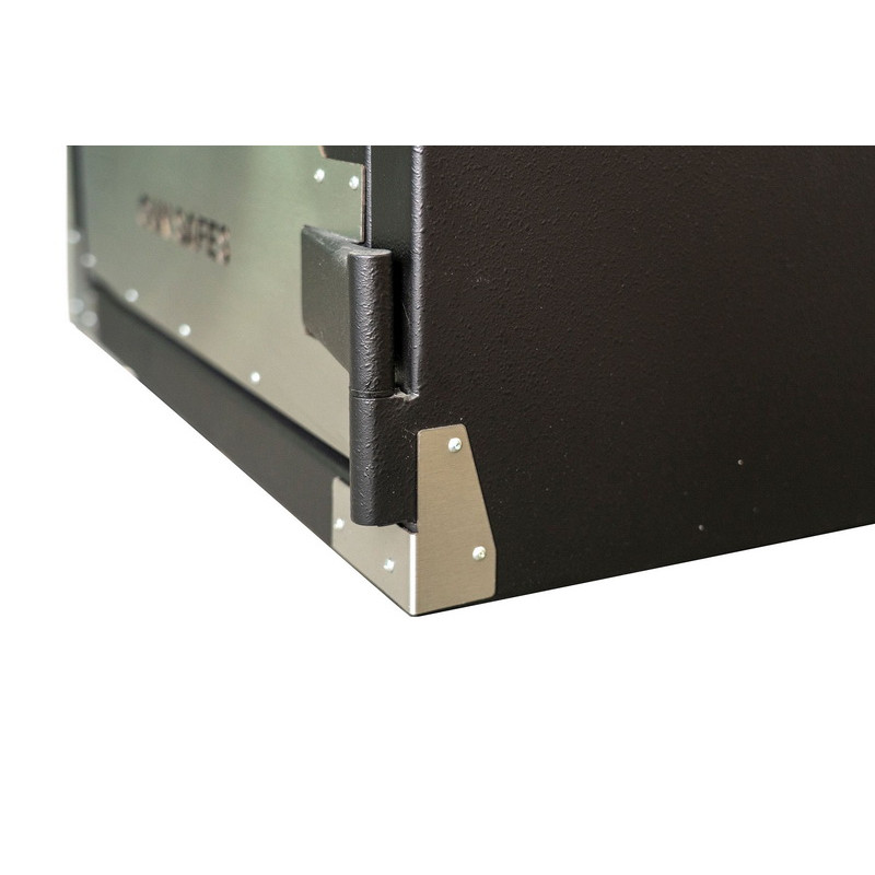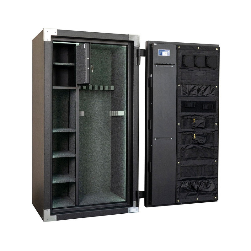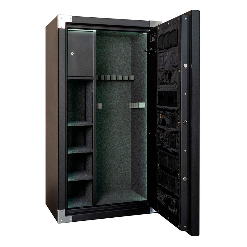 Designul premium include placi decorative din inox, iar interiorul este captusit cu mocheta gri-inchis, oferind un aspect elegant. In plus, iluminarea LED si organizatorul pentru accesorii de arme sporesc confortul in utilizare.