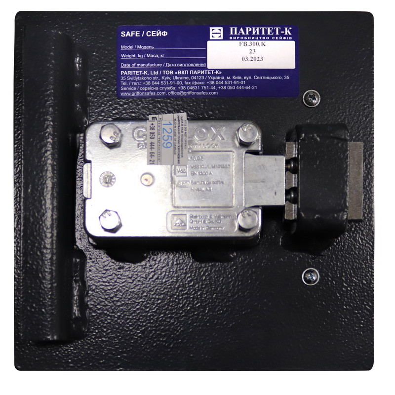 Zona incuietorii este protejata cu placi din otel tratat termic, care blocheaza incercarile de gaurire sau taiere. Inchiderea se face cu bolt masiv din otel, actionat manual, ceea ce face imposibila deschiderea fara cheia originala.