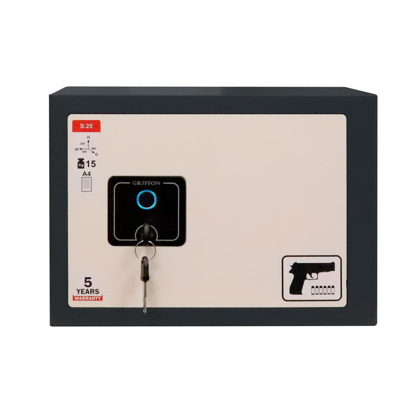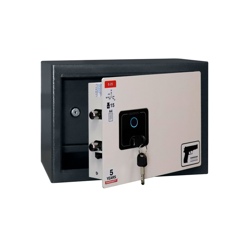 Seiful S.25.FPP este un model compact și sigur, conceput pentru depozitarea a până la două pistoale și a muniției într-o casetă interioară cu închidere separată. Datorită incuietorii biometrice, accesul este rapid și securizat, prin amprentă, oferind protecție sporită împotriva accesului neautorizat.