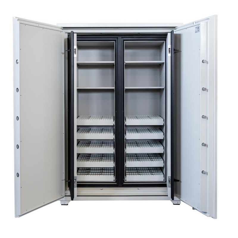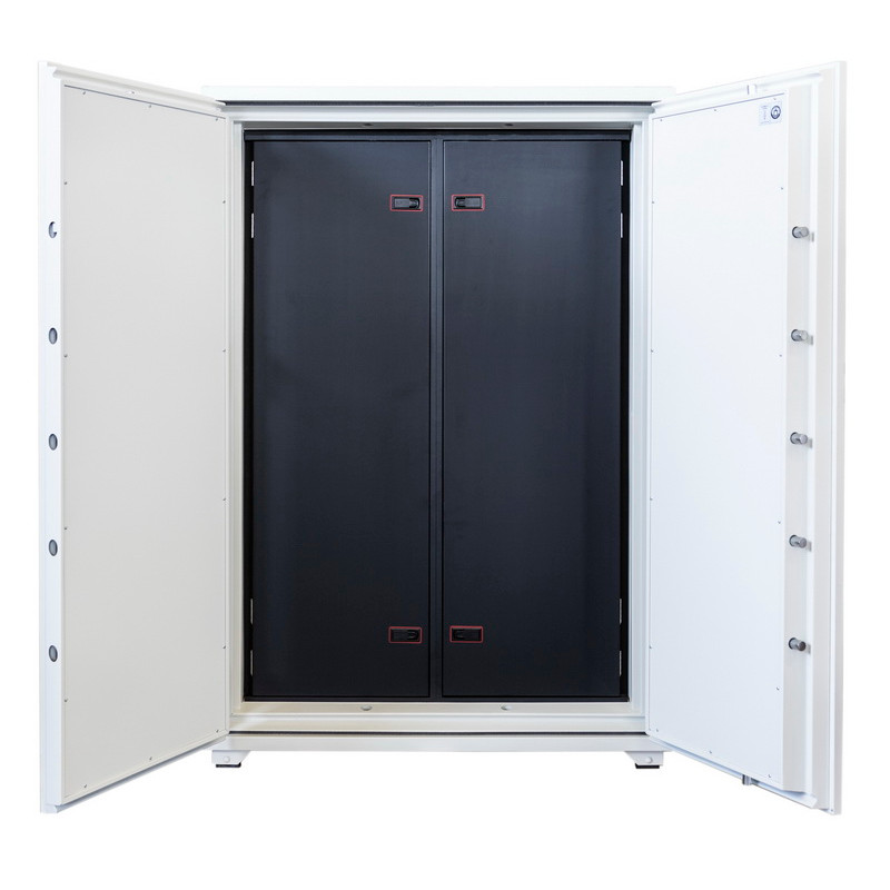 Usa este echipata cu o incuietoare de inalta securitate cu cheie cu barbie dubla, certificata EN 1300, garantand siguranta si fiabilitate maxima. In interior, seiful dispune de o cutie suplimentara din panouri melaminate si materiale termoizolante, conceputa special pentru a izola mediile de stocare sensibile.