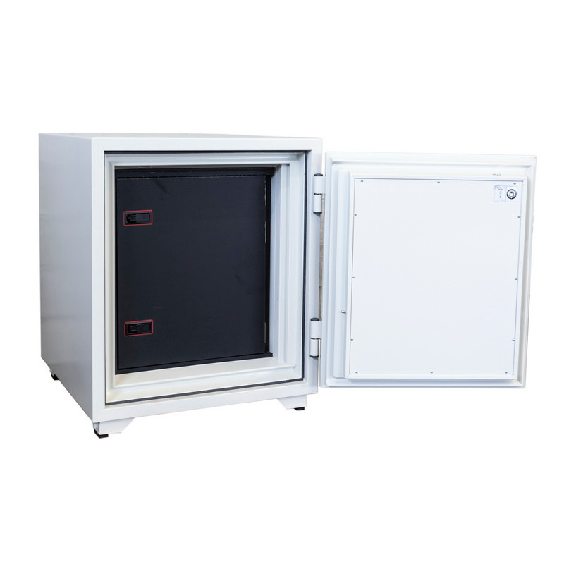 Usa este echipata cu o incuietoare de inalta securitate cu cheie cu barbie dubla, certificata EN 1300, garantand siguranta si fiabilitate maxima. In interior, seiful dispune de o cutie suplimentara din panouri melaminate si materiale termoizolante, conceputa special pentru a izola mediile de stocare sensibile.