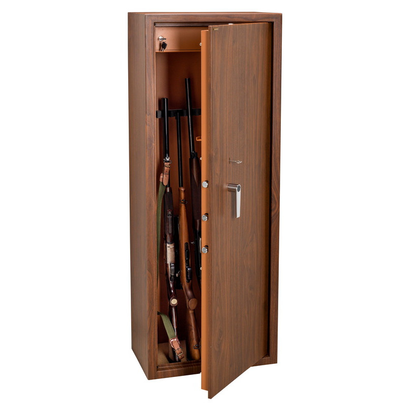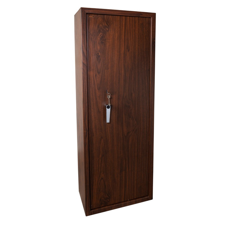 Interiorul dulapului include suport reglabil din cauciuc, covoras protector la baza si compartiment superior inchis separat pentru munitie, oferind organizare si siguranta optima. Finisajul elegant in efect lemn cherry, obtinut prin sublimare, transforma acest dulap intr-o piesa estetica potrivita atat pentru locuinte, cat si pentru birouri sau spatii de colectie.